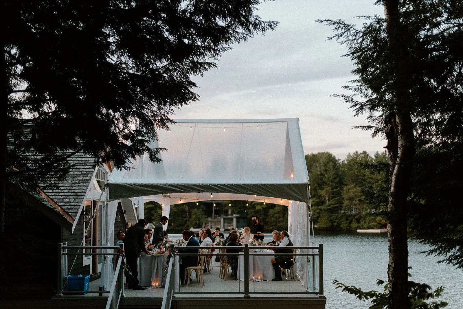 We would joke that the couple’s family cottage was the ultimate wedding destination. It literally felt like a resort and access to possibly everything you could need at your fingertips. The most adorable chapel just across the lake (you guessed it, boat accessible and an epic entrance for our groom)… the “unintended” but perfectly designed two-story boathouse, that would offer a bridal getting ready area, later used for vendor seating, and than a cozy little nook for our dessert table. An upper patio that could host a covered tent without creating obstructions to the jaw dropping Muskoka lake views. Casual seating on the lower level for an after dinner dance party (don’t worry we lined the docks edge with candles and floral barriers to avoid any missteps). The catering team might have had to navigate more stairs than they had seen consecutively in one season, however an important takeaway when hiring the right people and at a location like this… Bring them onsite in advance so they know what they are up against and avoid unwanted obstacles the day of.