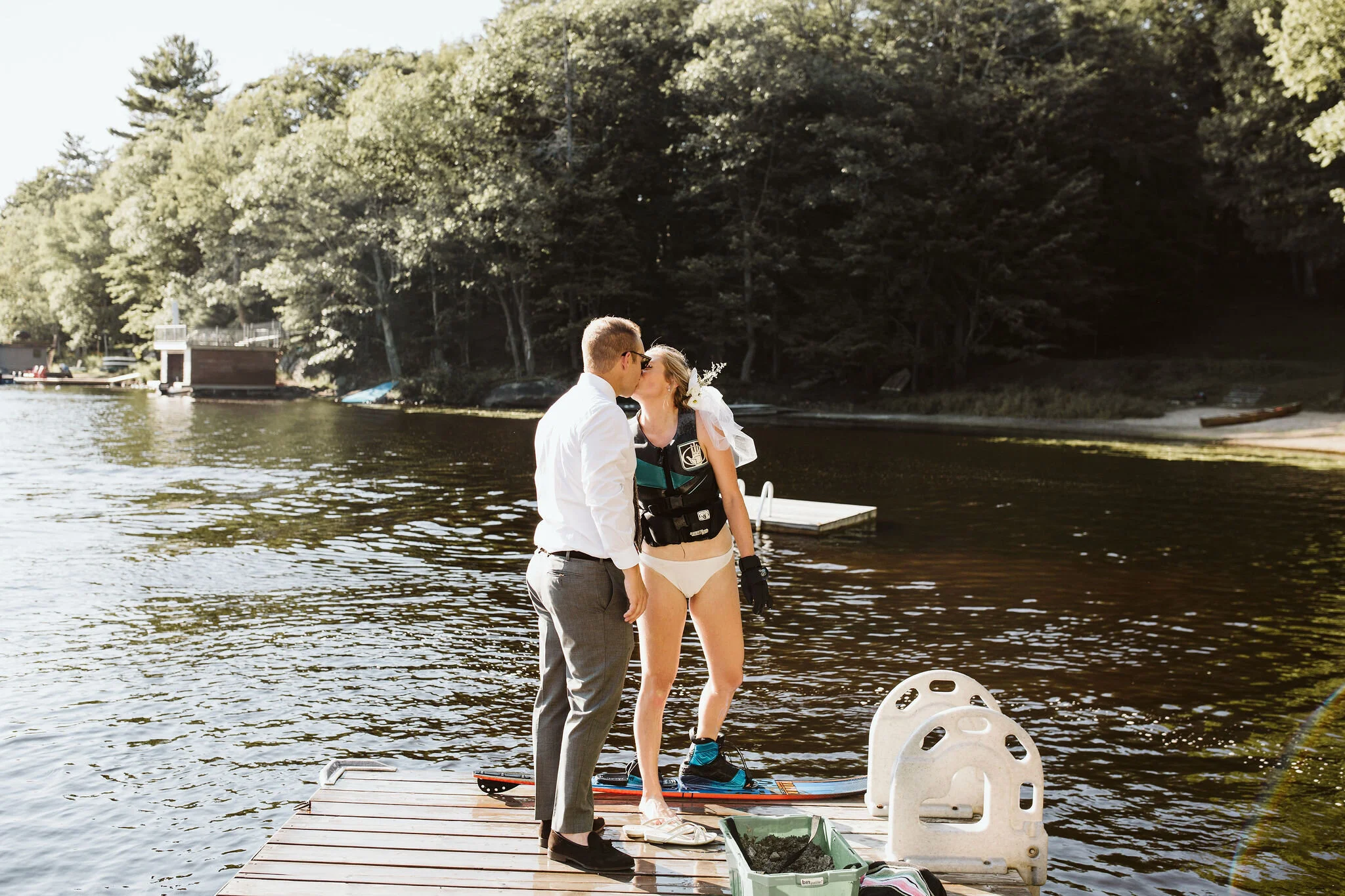 But before they got dinner started, the bride was itching to get out for a water ski. Not my average request of the wedding day (!), but we moved some things around in the timeline and sent her off to the lake while we all watched from the boathouse cheering her on! Upon return she quickly changed back into her wedding dress, smiling even bigger than before. Wow!