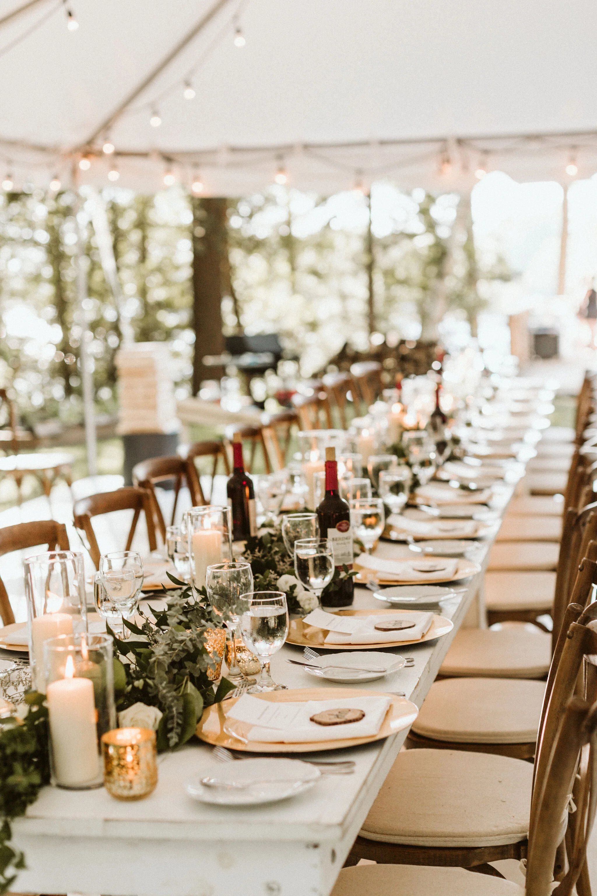 The dining tent was situated amongst the trees, one long table draped in greenery and an abundance of candles made it feel like an elevated and elegant family dinner. Over the meal, stories and memories of this very spot were exchanged, as they celebrated this new era in the setting of the family cottage that has been passed down for generations.