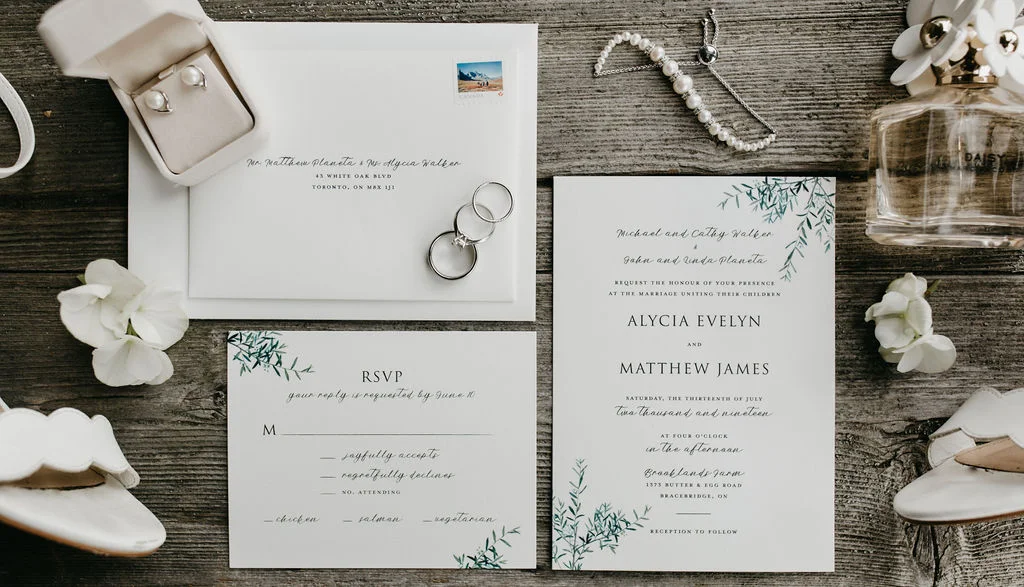 The wedding was held at Brooklands Farm in Bracebridge. This stunning property boasts amazing views from every angle so it was no surprise that Alycia had her hopes set on utilizing the outdoor spaces for many of the day’s events. And thanks to the cooperation of Mother Nature, we were able to do just that. The morning of the wedding was calm and stress free. As the bridal party popped the champagne and sang old school tunes, I had a barn full of helping hands to assist with set-up; Alycia's & Matt’s personal cheerleaders, friends and family were ready and willing to help make sure that everything was in place and arranged to the couple’s vision. The support was endless! Aunts, cousins, and friends all ready to fill centerpiece jars with seasonal florals, assemble menu cards, tie bows around the napkins, and set out place cards. Even the bride’s grandmother offered her impeccable penmanship for the hand-written seating chart. It was quite touching to see how much love went into pulling this day together.