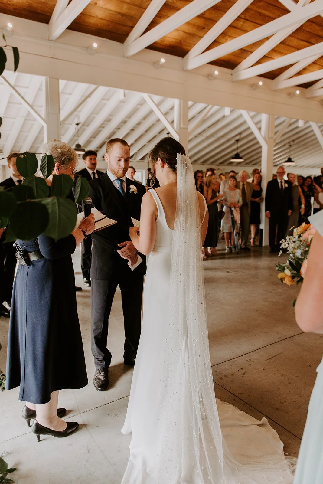 The wedding day came and it seemed we had bypassed the threat of rain - Woo hoo!… Well that was until our ceremony started and hello dark clouds. We pushed through and tried to keep with the outdoor nuptials but the weather gods just weren’t having it and the drizzle turned into a downpour. This is when kickass vendors come to the rescue; drying chairs, moving floral arches, directing guests, smiling all the while - One of my favourite shots in this wedding gallery is Amy’s entrance into the indoor ceremony location… Unrehearsed bridal party positions, guests surrounding the couple from every angle, became the most intimate and heartfelt setting for these two to exchange vows (after 3 solid attempts that day).