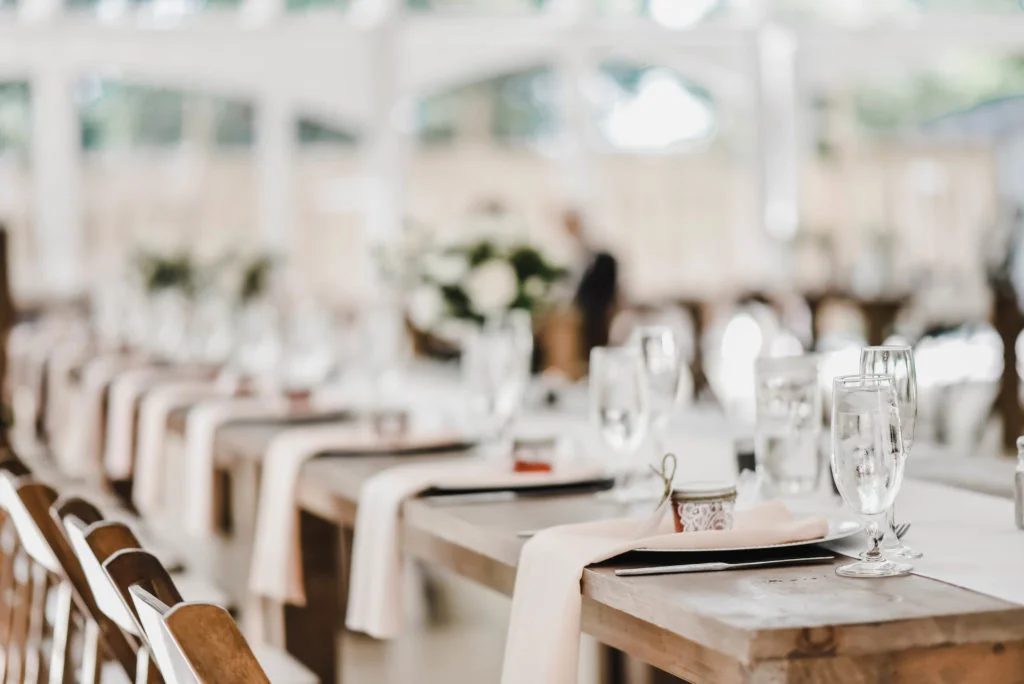 Guests were soon after invited into the reception tent, the décor of which also reflected the couple’s taste for elegant simplicity. Wood harvest tables lined the space, and burlap runners were dotted with trailing jars filled with seasonal florals and the aromatic smell of coffee, as [thanks to Pinterest] Brianna had the genius idea of filling the candle votives with coffee beans to pair perfectly with the brunch theme.