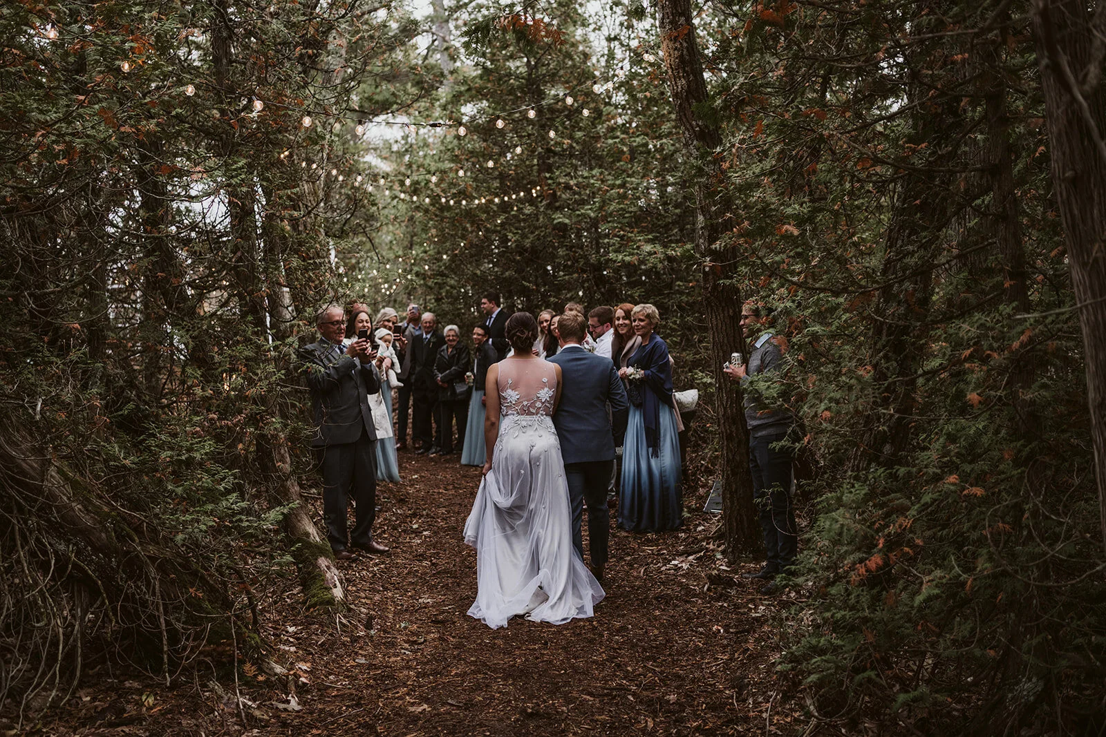 Embracing the cottage lifestyle, the day’s timeline was meant to be laidback. Guests were invited to the Island for late afternoon, greeted by yours truly to snap a quick photo, a fun personal touch we would later use (secretively) as each guest place card in the reception tent. Guests gathered in a clearing off the main dock, illuminated by Edison lights, unsure what was awaiting them. The Bride & Groom soon appeared, in lieu of tradition they entered together, gathering the troops for a review of the evening’s events. First off – the cocktail reception, where awaiting close by was a canoe filled oyster bar and unlimited amount of craft beer.